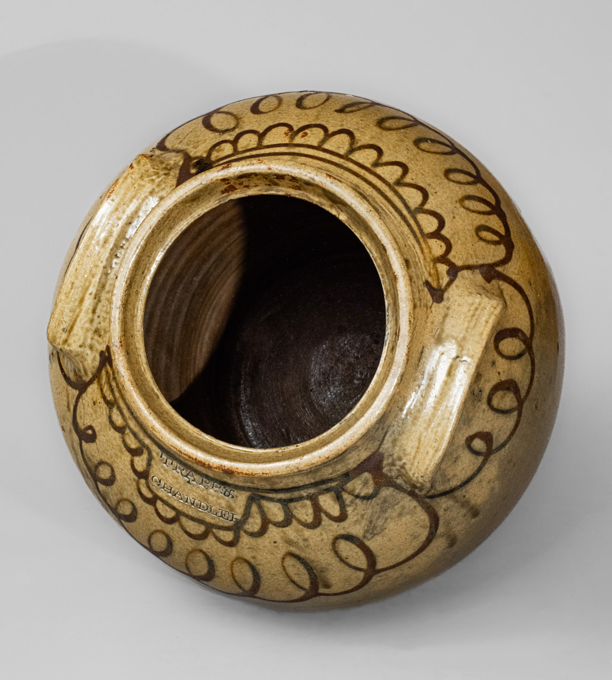 Rare and Fine Six-Gallon Alkaline-Glazed Stoneware Jar with Elaborate Iron Slip Decoration, Stamped "TRAPP.& / CHANDLER," Reverend John Trapp and Thomas Chandler, Edgefield District, SC, circa 1848-1850. Only the third marked Trapp & Chandler piece that we have offered, this recently surfaced work survives in exemplary condition and is the first example that we have seen with a decorative slip border around the stamp. Provenance: A fresh-to-the-market example, which descended in a Southern family.