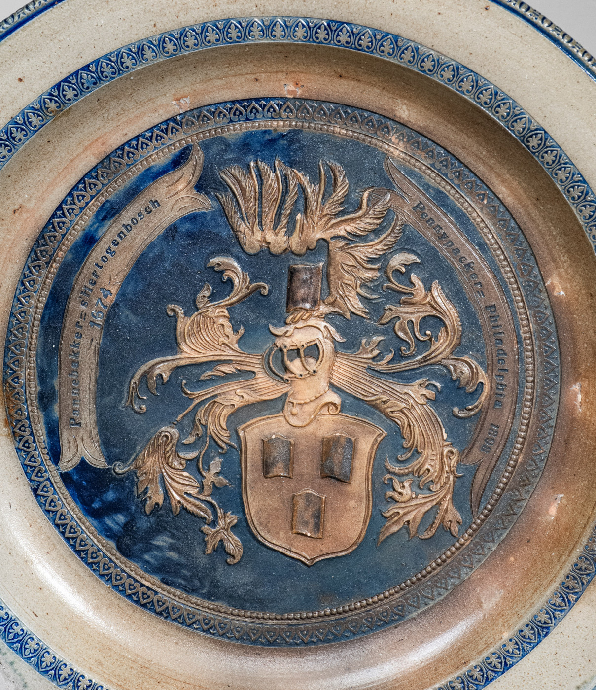 Extremely Rare Cobalt-Decorated Stoneware Charger with Relief Coat of Arms, Inscribed "Pennypacker= Philadelphia 1898," attributed to the Wingender Pottery, Haddonfield, NJ, 1898. Diam. 16".