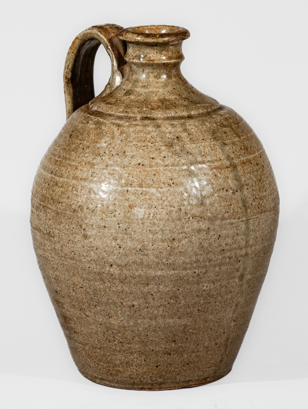 Extremely Rare Small-Sized Alkaline-Glazed Stoneware Jug with Incised Initial, Edgefield District, SC origin, circa 1825. This jug is reportedly one of only two jugs potted and inscribed in the manner. Its curious incised marking at the shoulder likely does not read "3," which would typically denote the capacity of the vessel, as the jug measures one gallon or less. Instead, the marking, likely a sideways script "m," probably refers to the jug's maker. The vessel's distinctive spout and handle treatments and thin-walled construction indicate a skilled craftsman with an artistic flair. The discovery of other examples may one day give an identity to this figure. Provenance: From a fifty-year SC collection. H 10 1/2".