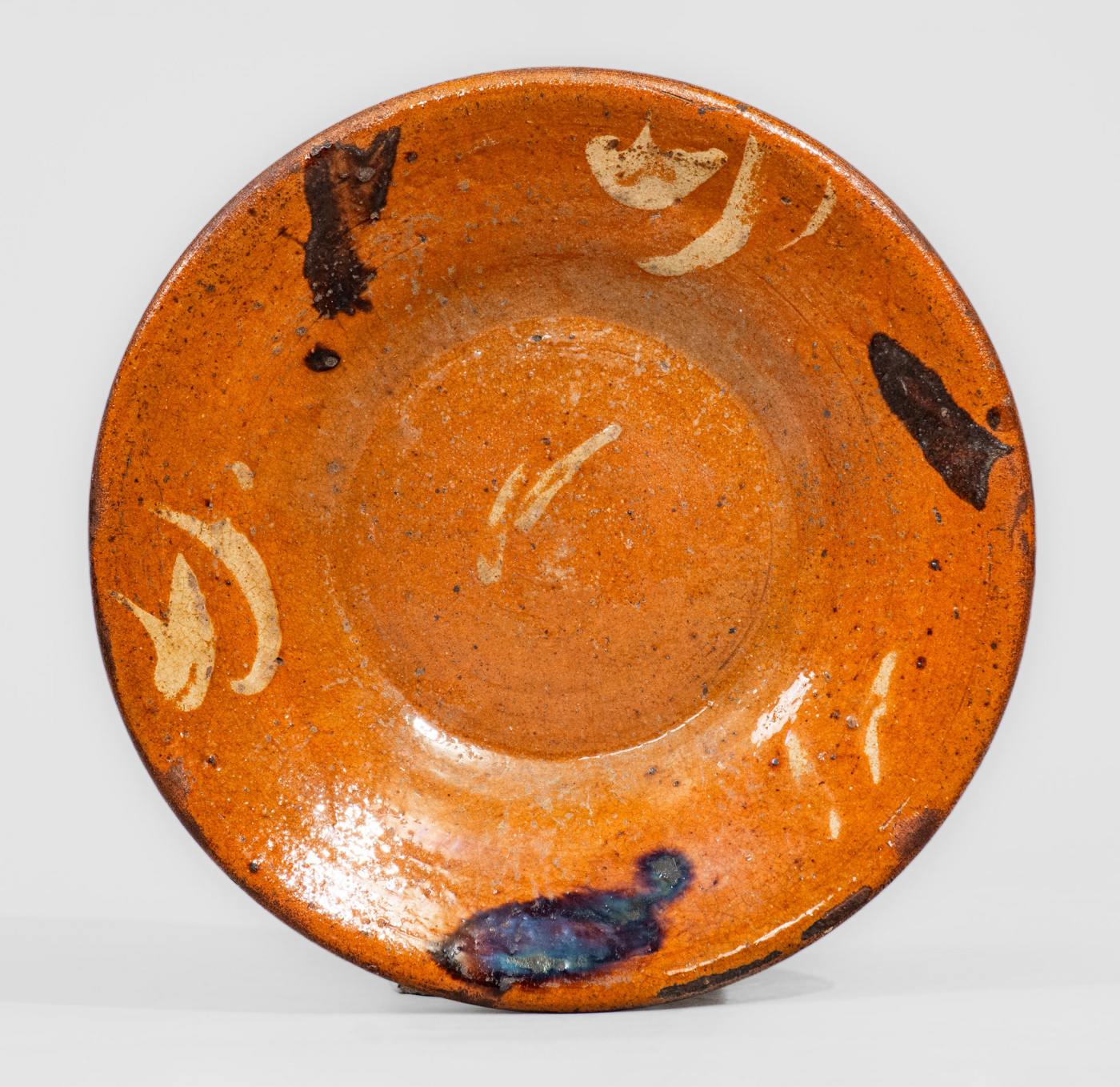 Glazed Redware Dish with Spattered Three-Color Slip Decoration, attr. to Solomon Loy, Alamance Co., NC, circa 1825-1840. Diam. 8 3/4" ; H 1 5/8".