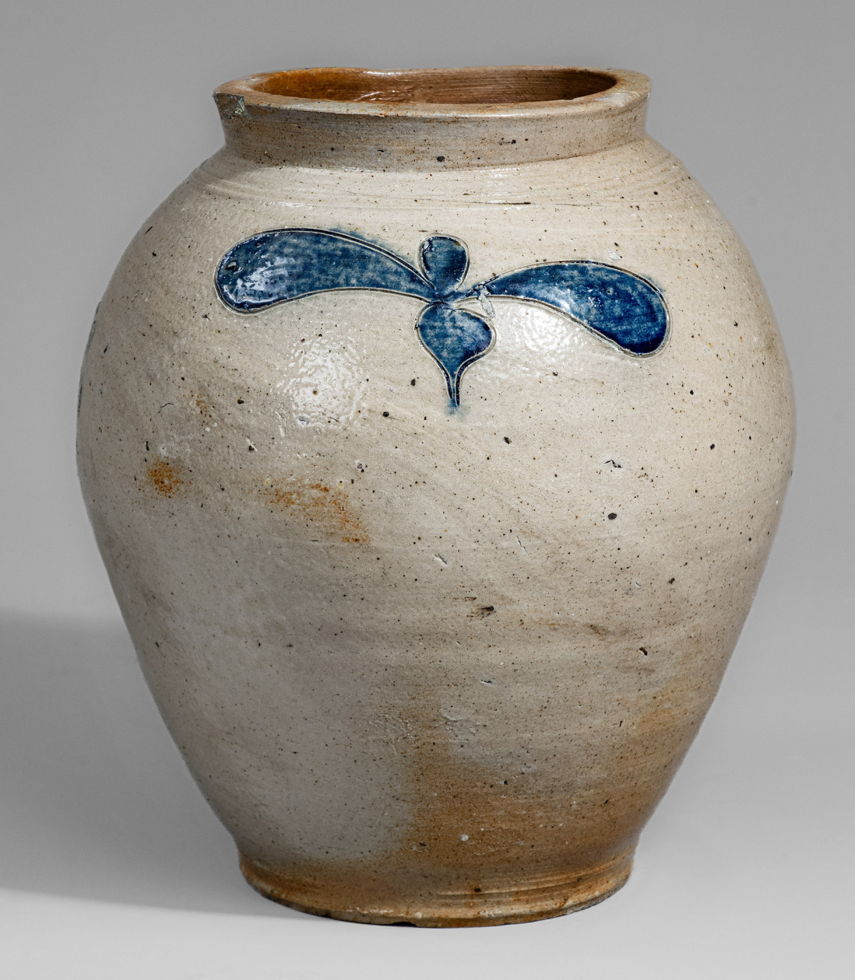 Rare Two-Gallon Stoneware Jar with Elaborate Cobalt Floral Decoration, Stamped "WILLSON'S & YOUNG. / HARRISBURG PA," circa 1855. Provenance: Herb and Carol Hausmann Collection. H 11 1/2".