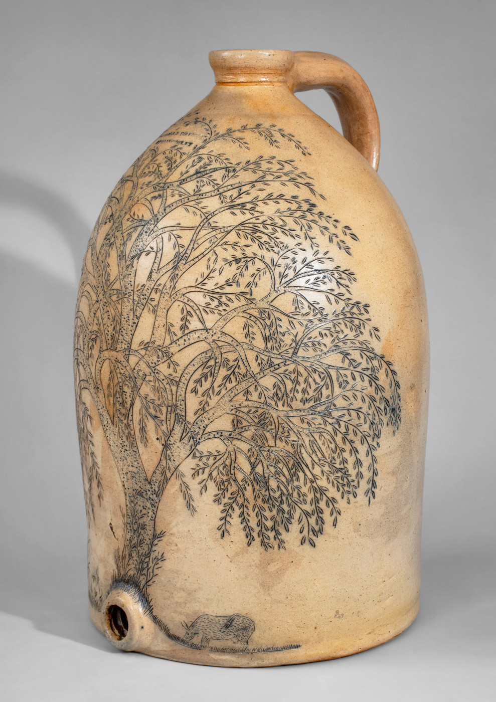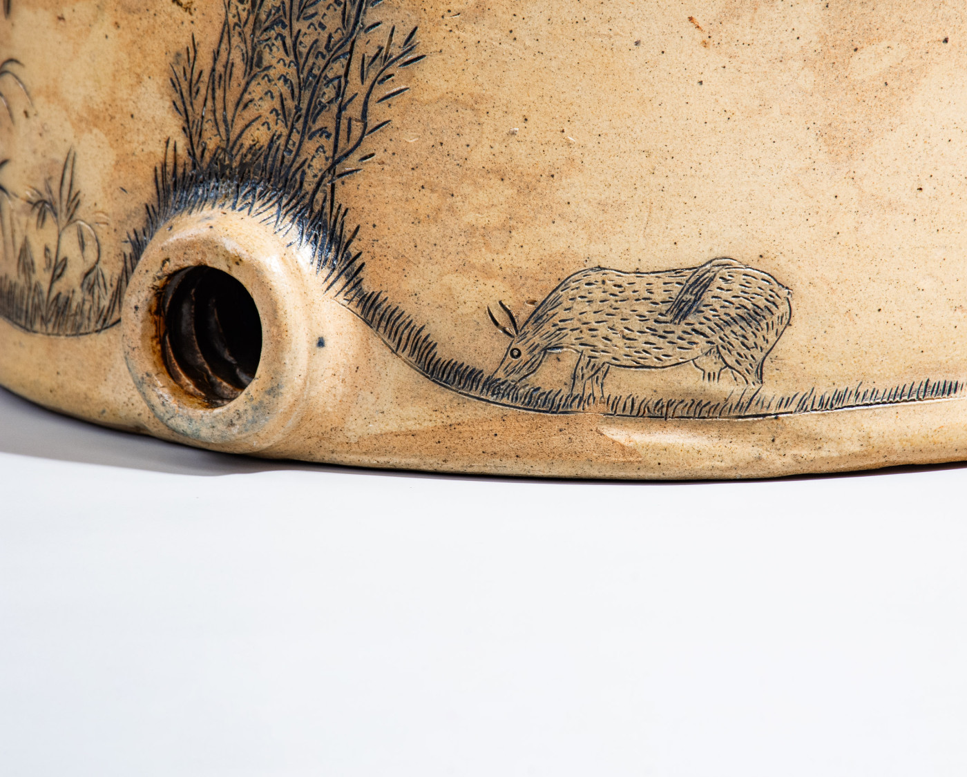 Displaying one of the most extravagant incised decorations known in 19th century American stoneware, this cooler ranks among the greatest surviving ceramic works from the state of Vermont. Sophisticated in its execution, the tree includes numerous overlapping branches that required forethought and delicate attention during the decorative process. The extravagant top-to-bottom tree assumes a life of its own, dominating the front and extending onto the sides of the vessel. Impressed rectangular treatment forms bark on the tree's surface and a feeding cow decorates the ground below. Easily the finest example known from this short-lived partnership, pieces of this extreme size and decorative quality were used as storefront display pieces advertising the pottery's work or used in local hotels for patrons to admire while pouring a drink.