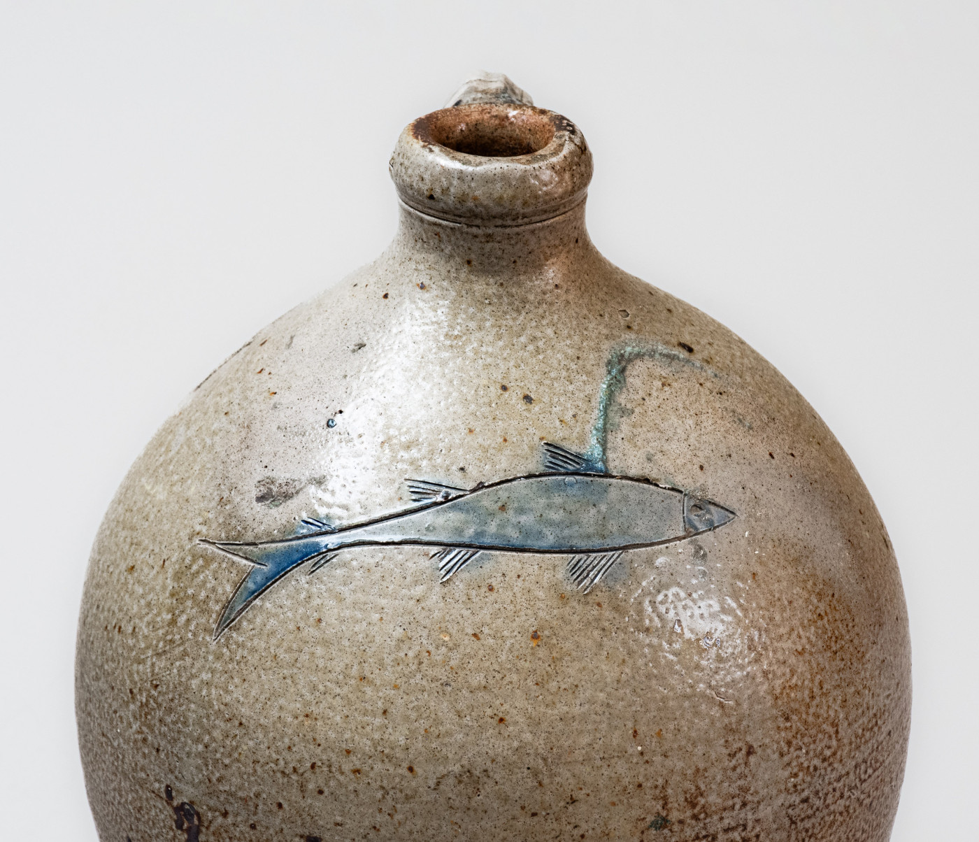 Fine Two-Gallon Stoneware Jug with Incised Fish Decoration, Albany, NY area, early 19th century. Provenance: Cathy Treffeisen Collection. H 14 1/2".