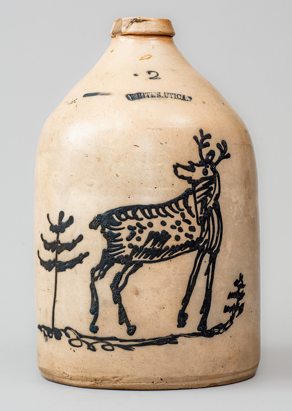 Rare Two-Gallon Stoneware Jug with Cobalt Deer Scene, Stamped "WHITE'S UTICA.," NY State origin, circa 1865. Relatively few deer decorations from this pottery are known. Provenance: Cathy Treffeisen Collection. H 14".
