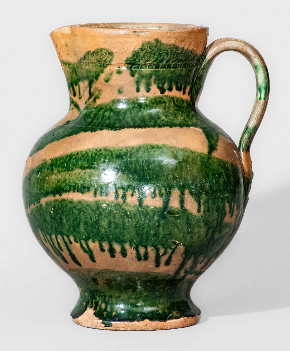 Glaze, Form, and Maker. Extremely Rare Redware Pitcher with Profuse Copper Slip Decoration, attributed to Christopher Alexander Haun, Greene County, TN, circa 1840-1860. One of a few Haun pitchers known and the only documented example featuring this wonderful, highly-stylized form. Possibly Haun's most artistic pitcher in existence, this work highlights this potter's flair for the dramatic, showcasing his abilities as both a potter and decorator. Provenance: Originally purchased in Sneedville, Hancock County, TN. Exhibited: Tennessee Turned, Earthenware and Stoneware Made in East Tennessee 1800-1900, Museum of East Tennessee History, May 16-October 30, 2011. Literature: Illustrated in Wahler, Tennessee Turned, Earthenware and Stoneware Made in East Tennessee 1800-1900, Part One, fig. 48, p. 55, p. 84, pl. 6, p. 196, fig. 48, and p. 229, pl. 6. H 8 1/4".