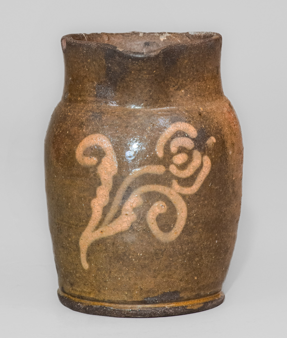 Extremely Rare Small-Sized Redware Cream Pitcher with Cream-Slip Floral Decoration, attributed to the Mottern Pottery, Carter County, TN, circa 1870-1890. This redware piece appears to have nearly reached a vitrifying stoneware temperature in the firing, resulting in a dark gray coloration to the vessel's unglazed bottom. The only Mottern pitcher that we have ever offered, this work features outstanding size and strong decoration in the pottery's distinctive slip-trailed style. H 4 7/8".