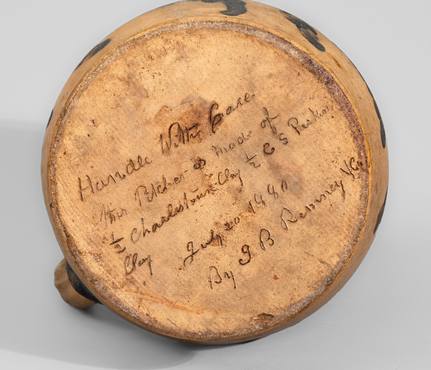 A remarkable aspect of this work is its striking similarity in form and decoration to pieces produced at the Philadelphia potteries of relatives, Henry Harrison Remmey (his uncle) and Richard Clinton Remmey (his cousin), offering the possibility that some so-called Philadelphia stoneware may have actually been produced in Cecil County, Maryland. The wonderful inscriptions including the name of the pitcher's owner and property, the clay involved, its maker, date of manufacture, and the appealing maxim, "Handle with Care," define this work as the finest known example of Maryland stoneware made outside of Baltimore City. H 14".