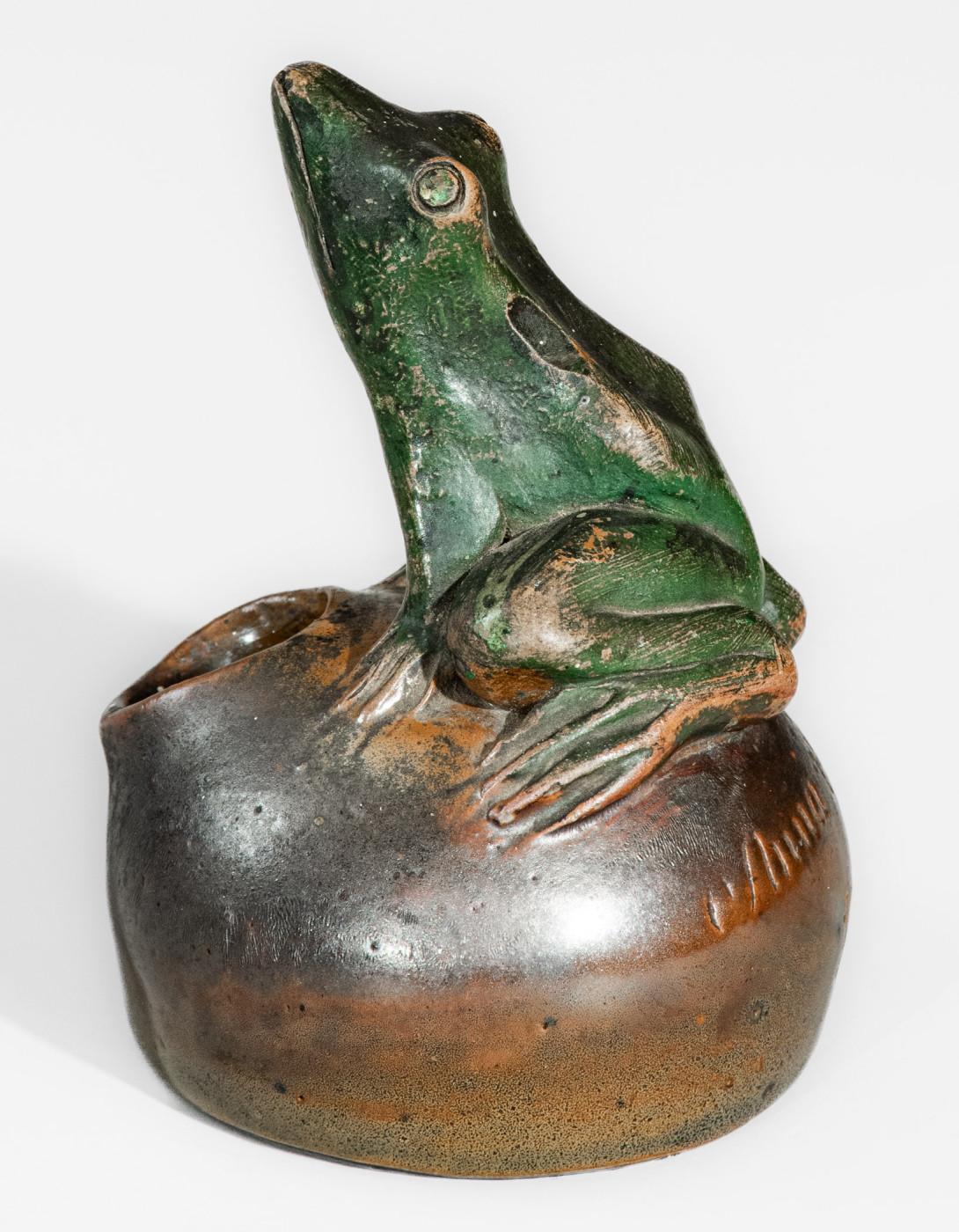 Fine Anna Pottery Stoneware Frog Inkwell, Inscribed "Anna Pottery / 1876," Wallace and Cornwall Kirkpatrick, Anna, IL, 1876. Provenance: From a long-term Illinois collection consigned to this auction. H 3 3/4".
