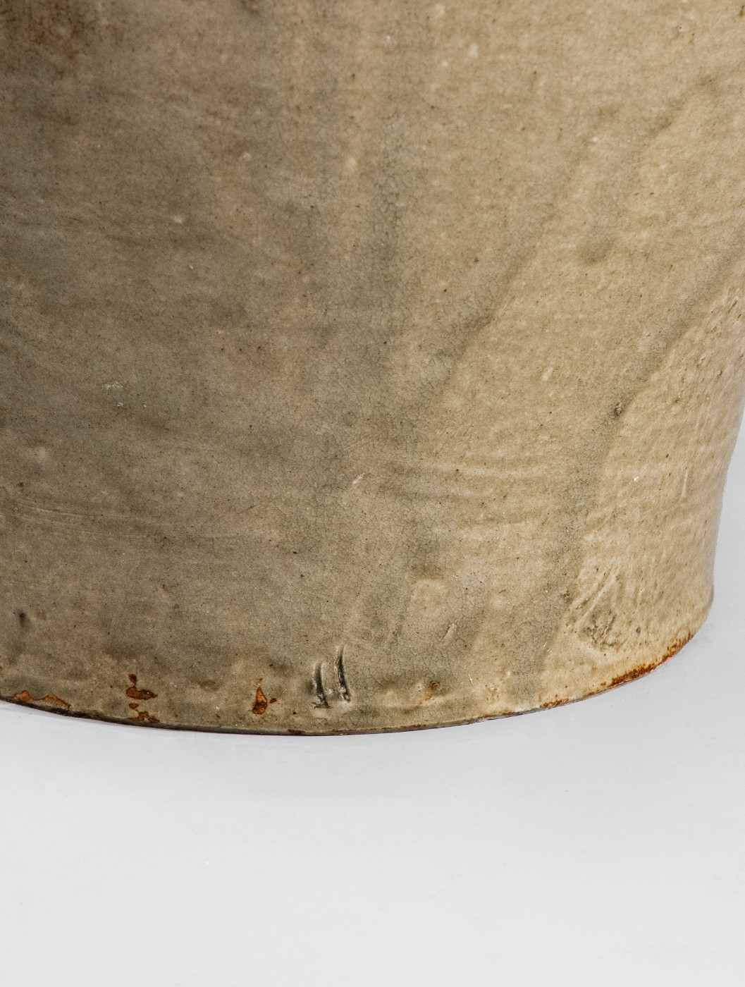 Rare and Fine Five-Gallon Alkaline-Glazed Stoneware Jar, attributed to Harry at Pottersville Stoneware Manufactory, Edgefield District, SC, circa 1830s-early 1840s. The attribution to this potter lies in the jar's distinctive flattened rim and handles. These characteristics, along with the jar's glaze, closely relate it to those exhibited on a jar signed "Harry," sold in Crocker Farm, Inc.'s Spring 2021 auction, lot 53. The base of the jar is incised with two slash marks. A horizontal handprint appears at the base as well, presumably created by Harry, depressed into the soft clay when the jar was removed from the wheel. Provenance: From a fifty-year SC collection. H 15".