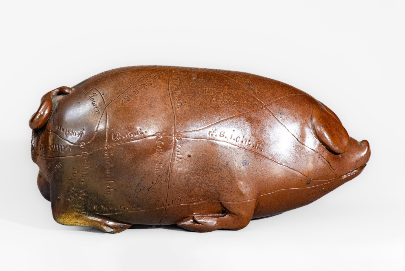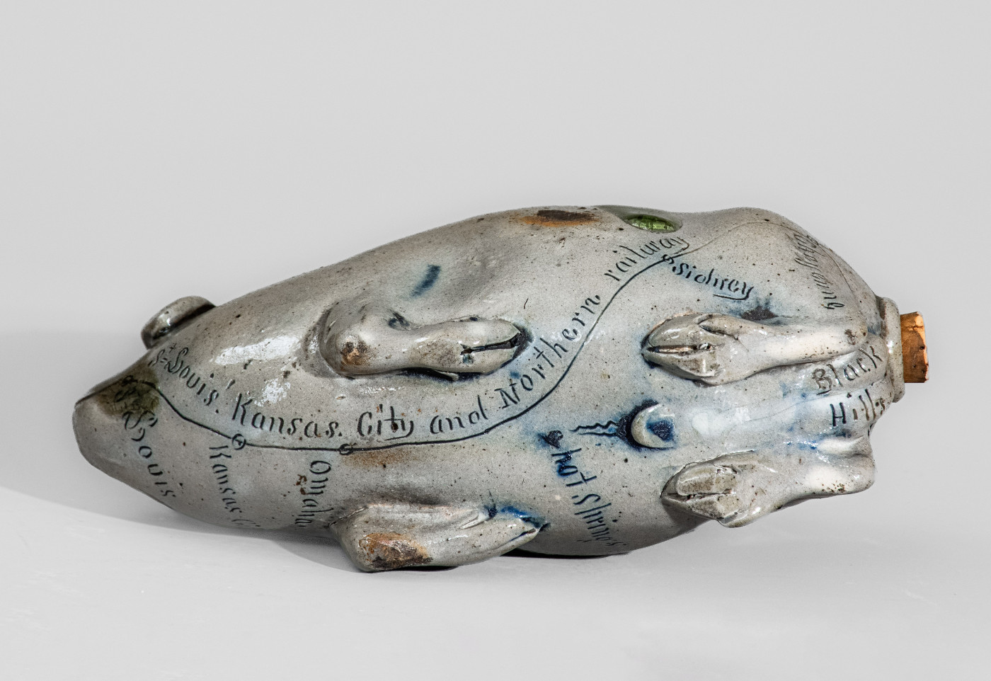 Rare and Fine Anna Pottery Salt-Glazed Stoneware Pig Flask with Black Hills Inscription, Wallace and Cornwall Kirkpatrick, Anna, IL, circa 1880. Provenance: From a long-term Illinois collection consigned to this auction. L 6 3/4".
