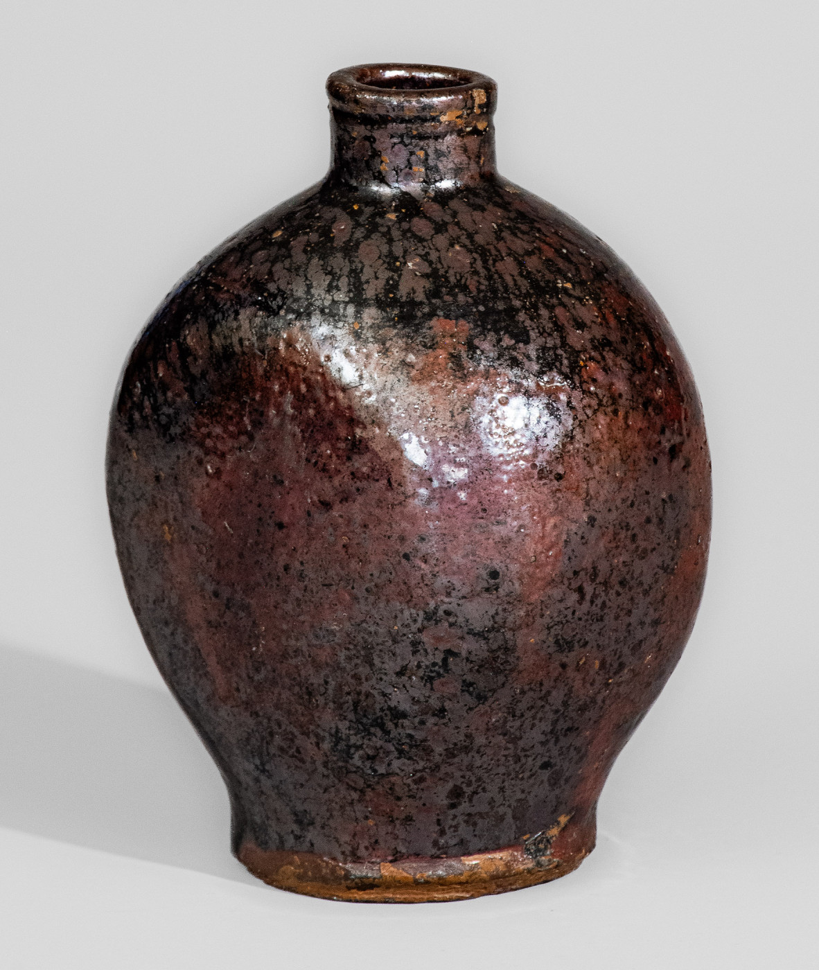 Extremely Rare Alkaline-Glazed Stoneware Flask, TX origin, probably Jefferson S. Nash Pottery, Marion County, TX, circa 1850-1860. This wide-bodied flask features distinctive maroon highlights over a blackish-brown ground, coloration most commonly associated with pieces produced at the pottery of Georgia-born entrepreneur, Jefferson S. Nash. Though a small number of ring flasks from his pottery are known, this flask is the only example of this specific form produced in Texas that we are aware of. H 5 1/2".