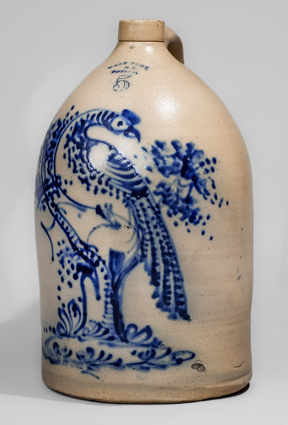 Best Pheasant on Stump. Magnificent Five-Gallon Stoneware Jug with Elaborate Cobalt Pheasant on Stump Decoration, Stamped "WEST TROY / N.Y. / POTTERY," circa 1875.