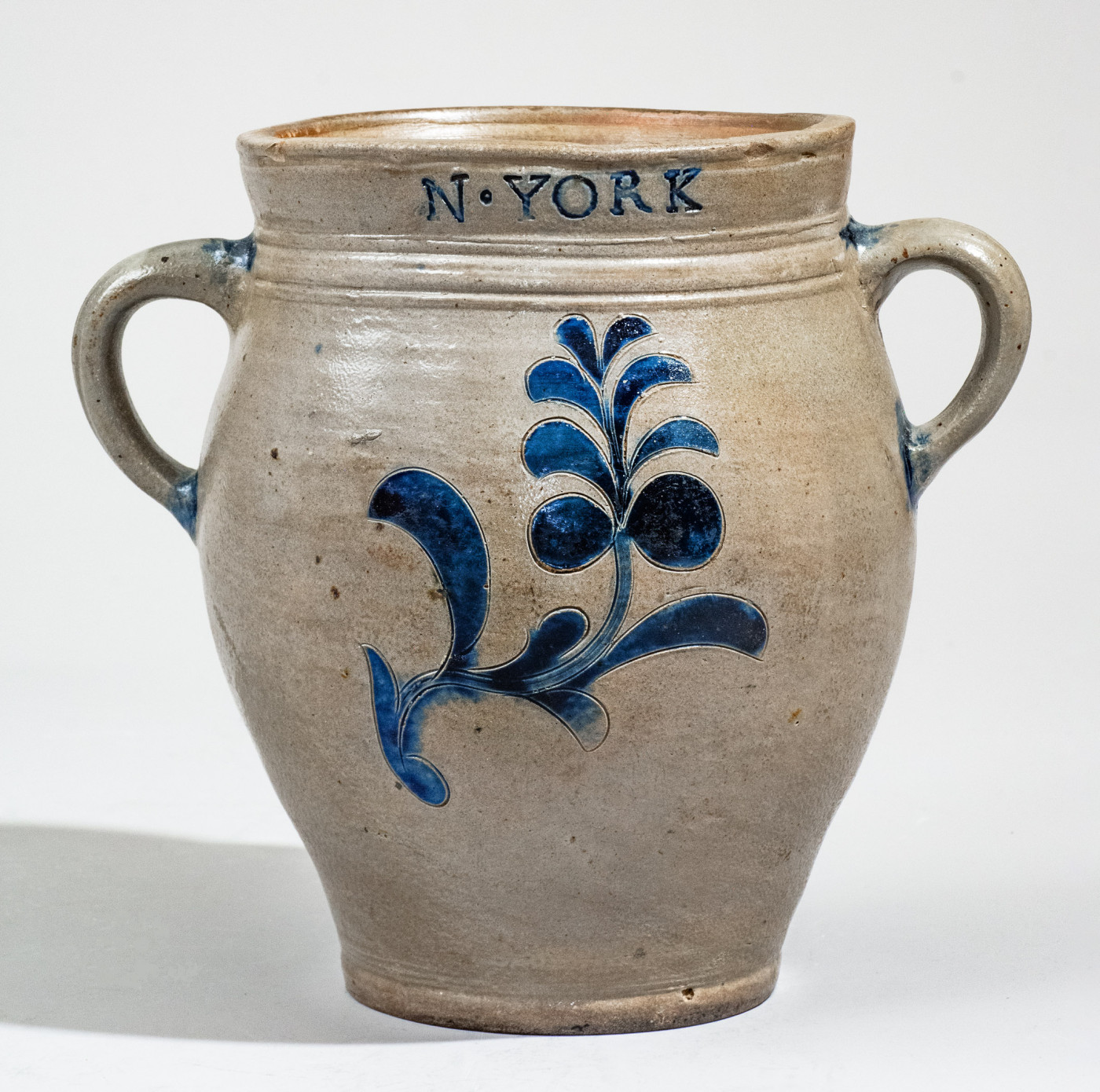 In the American Style. Exceedingly Rare and Important One-Gallon Stoneware Jar with Impressed and Cobalt-Highlighted Federal Eagle and Incised Foliate Decorations, Stamped "C. CROLIUS / MANHATTAN, WELLS / NEW-YORK," early 19th century. This work draws from the Clarkson Crolius's Westerwald heritage in its incised decoration, while touting its American manufacture with its impressed eagle motifs on the front and reverse. One of only two eagle-stamped Crolius pieces that we are aware of and one of the finest marked Crolius jars known. Provenance: Crocker Farm, Inc., March 14, 2015, lot 11. H 8 3/4".