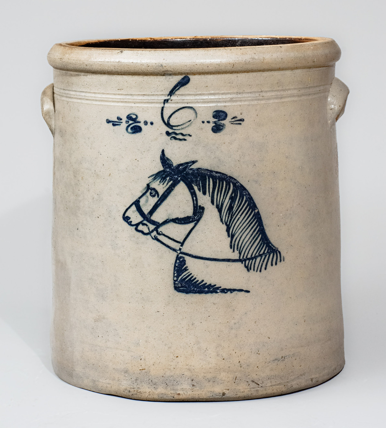 Rare Six-Gallon Stoneware Crock with Cobalt Horse Head Decoration, Ohio origin, circa 1875. H 13 1/2".