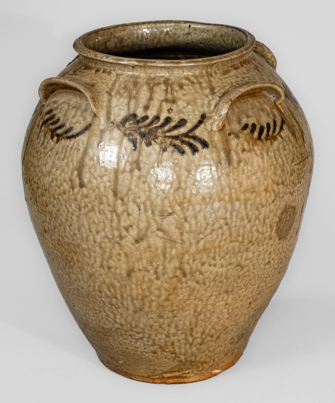 Rare Four-Handled Alkaline-Glazed Stoneware Jar with Iron Slip Foliate Decoration, attributed to Thomas Chandler, Edgefield District, SC, circa 1845. Exceptional size, measuring roughly ten to twelve gallons, featuring the region's coveted four-handled form. Provenance: From a fifty-year SC collection.