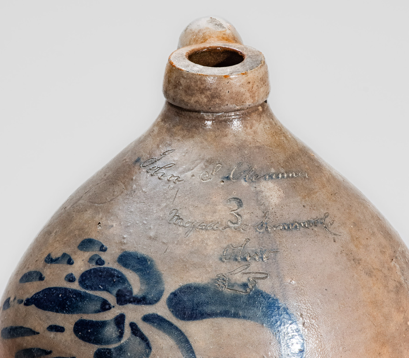 A Potter and an Abolitionist. Extremely Rare Three-Gallon Stoneware Jug with Large Cobalt Floral Decoration, Incised "John S. Clemmer / Mogadore Summit Co / Ohio", mid 19th century.