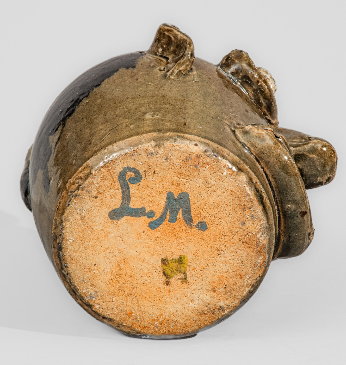 Mother and Son Collaborative Work. Exceedingly Rare and Important Early-Period Alkaline-Glazed Stoneware Face Jug with Rock Eyes and Black Slip Decoration, Signed "L.M.," Lanier and Arie Meaders, Cleveland, GA origin, circa late 1960s. While the thrown and modeled face jug is Lanier's creation, showing the influence of his father, Cheever, in its large rock eyes, its slip decoration was likely applied by his mother, Arie, who used matching brushwork on her own face jugs. Although a number of vases and other forms have been documented as made by Cheever and Arie working together, this collaboration between mother and son is more unusual. Indeed, this face jug is the first of its kind that we have seen combining the efforts of both of these Meaders family members. Its early period of manufacture, highly-prized rock eye treatment and exceedingly rare slip decoration, place it among the very best face jugs known by any member of this illustrious Southern potting dynasty. Provenance: Brunk Auctions, Asheville, NC, January 6, 2007; Frank W. White Collection. H 9".