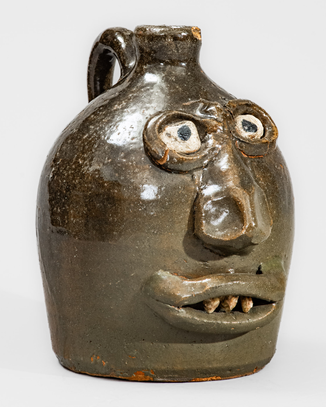 Rare and Fine Alkaline-Glazed Stoneware Face Jug with China Plate Teeth, Signed "Lanier Meaders," Cleveland, GA origin, circa early 1970s. Meaders's face jugs produced with china plate teeth are among his rarest and most desirable examples of this form. Only the second such piece that we have offered, the other having sold in our Summer 2021 auction, lot 383. Literature: For a related jug, see Crocker and Crouch, Jr., The Folk Pottery of Cheever, Arie, and Lanier Meaders: A Pictorial Legacy, front cover. Provenance: Frank W. White Collection. H 9 3/4".