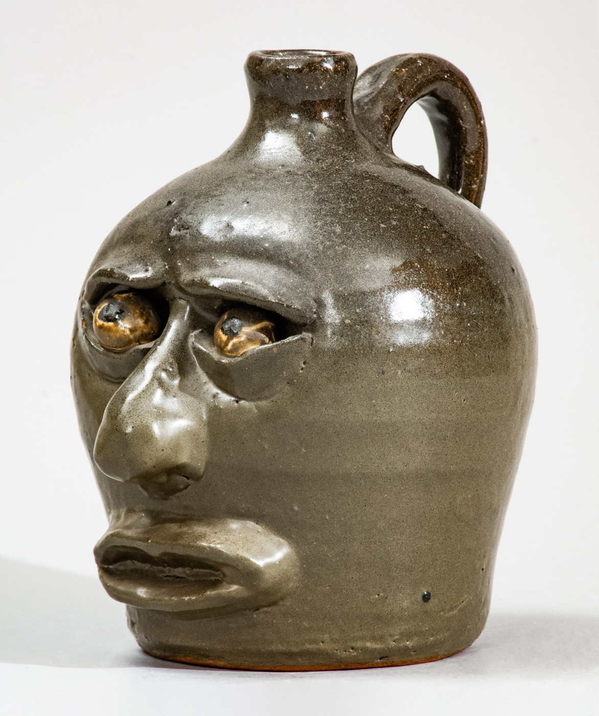 Southern Icon. Rare and Fine Small-Sized Stoneware Face Jug with Kaolin Eyes and Teeth, Edgefield District, SC, origin, third quarter 19th century. A particularly fine example of this prized South Carolina form, this face jug, and others by this same, anonymous maker, are distinguished by their small size, bold facial expressions, and delicate application of the facial features. While other face jugs from this region appear more hastily executed, jugs by this maker appear more refined, finished, and symmetrical. Provenance: A fresh-to-the-market example, which descended in a New England family to its current owner. H 4 3/4".