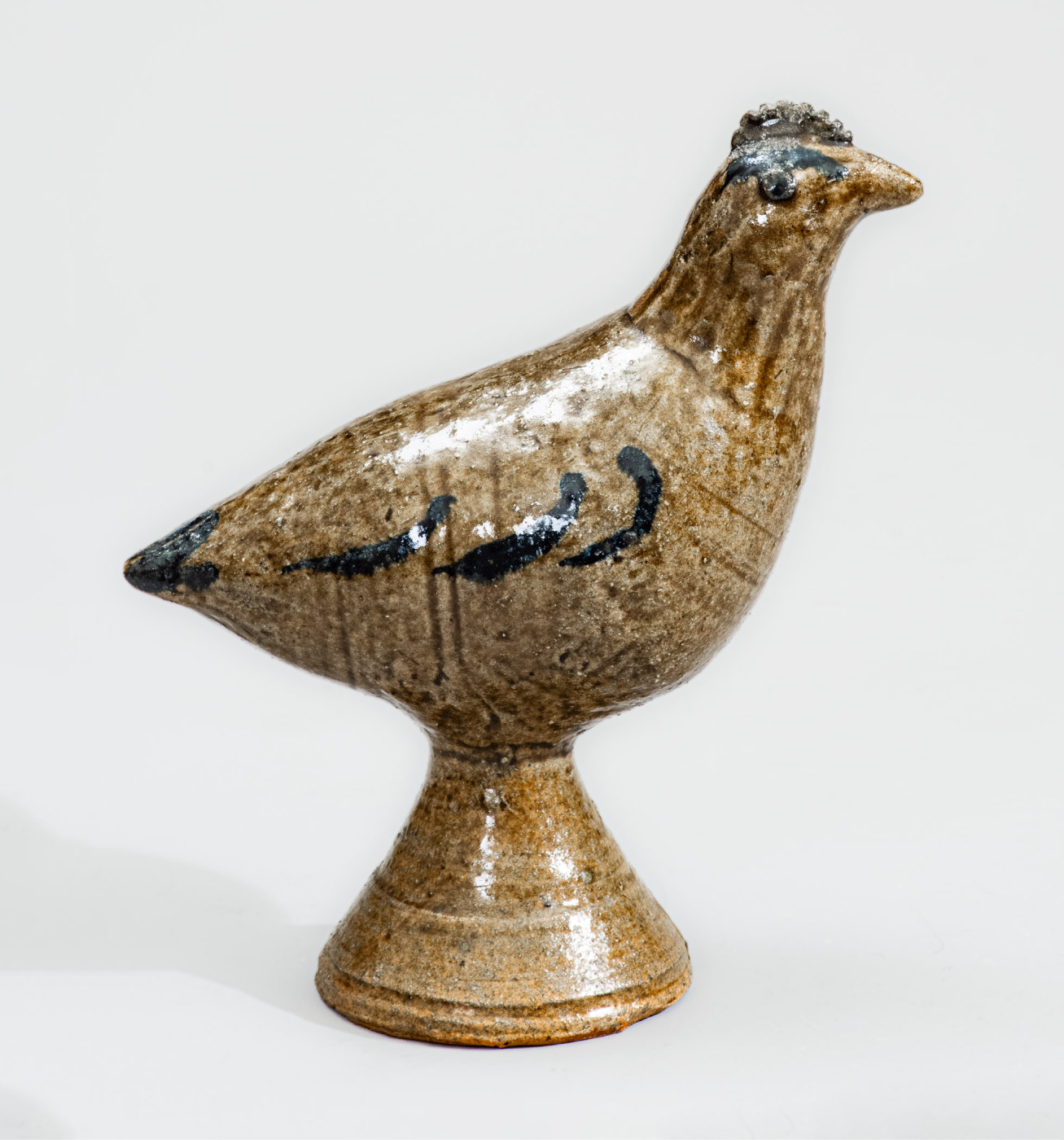Scarce Alkaline-Glazed Stoneware Figure of a Quail with Brown Slip Decoration, attributed to Arie Meaders, Cleveland, GA, circa 1956-1969. Provenance: Frank W. White Collection. H 7 1/8".