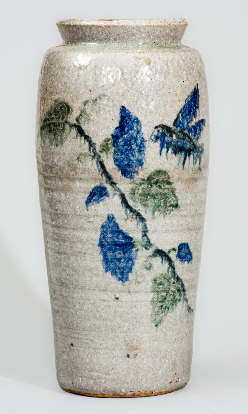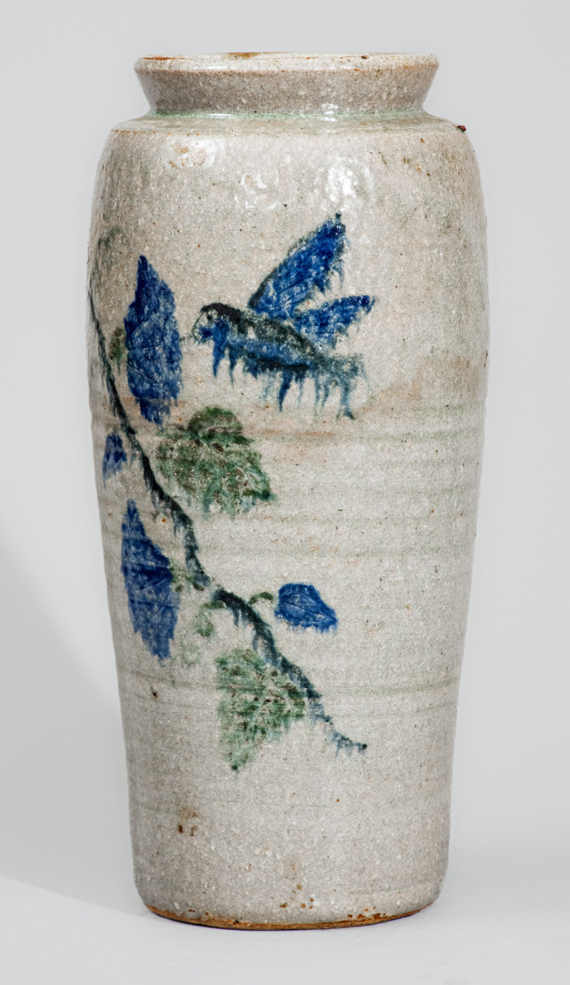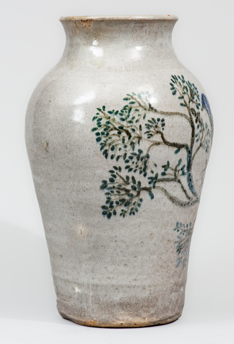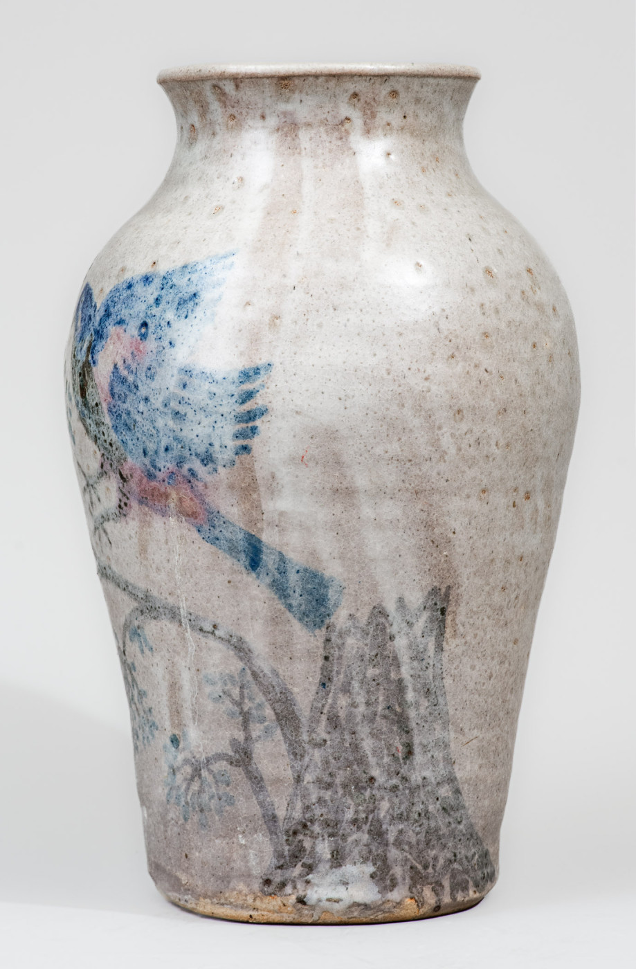 Arie Meaders Masterpiece. Outstanding and Important Large-Sized Stoneware Vase with Exuberant Multi-Colored Slip Bird-and-Stump Decoration, attributed to Arie Meaders, Cleveland, GA, circa 1956-1969. Among Arie Meaders's finest creations known, this work is distinguished by the size, detail, subject matter, and color of the design. We can find no record of another Meaders family vase of this quality coming to auction. Exhibited: "Georgia Potters: Then and Now," Madison-Morgan Cultural Center, Madison, GA, April 25-July 5, 2006, illustrated on the cover of the exhibit brochure. Provenance: Frank W. White Collection. H 13 3/4".