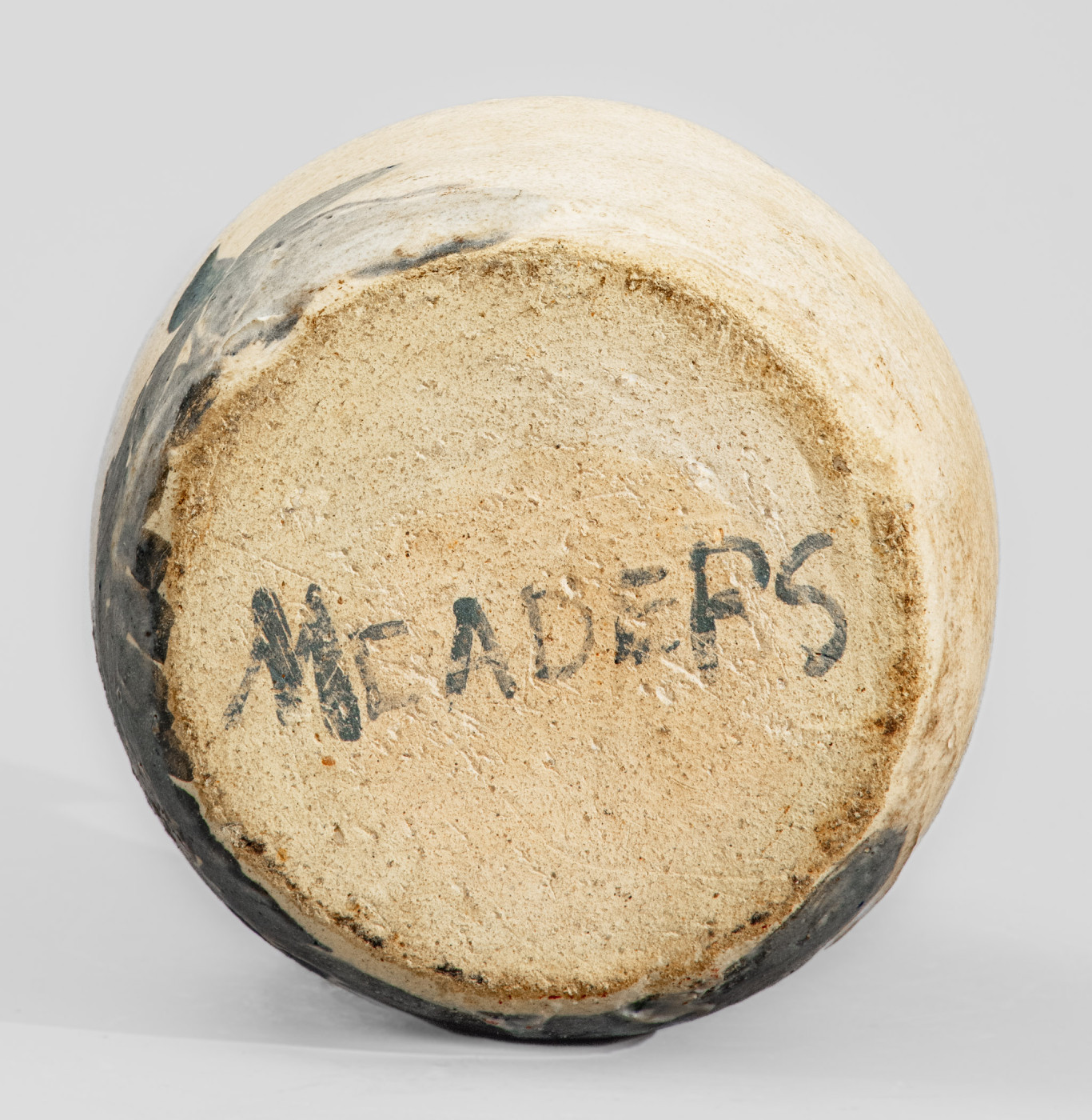 Extremely Rare Stoneware Vase with Multi-Colored Slip Palm Tree Motif, Signed "MEADERS," Arie Meaders, Cleveland, GA, circa 1956-1969. The only Arie Meaders vase that we have seen featuring this decoration. Underside with rare style of signature, applied in blue slip, reading simply "MEADERS." Provenance: Frank W. White Collection. H 9 3/8".