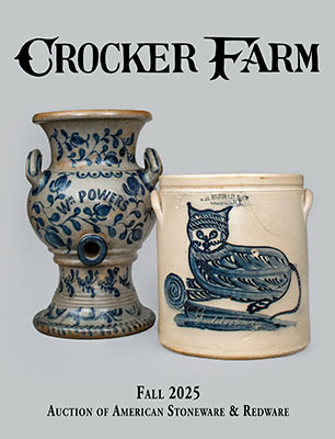 Our Fall 2025 Auction of American Stoneware & Redware, held online beginning Wednesday, November 5, features numerous examples of museum-quality ceramics from the Northern, Southern, Mid-Atlantic, and Midwestern U.S. This catalog, as usual, presents hundreds of lots in full color with detailed descriptions and condition reports. Our catalogs make great references on antique American pottery, and you can pre-order your copy today and have it shipped to you as soon as it's back from the printer, late October.